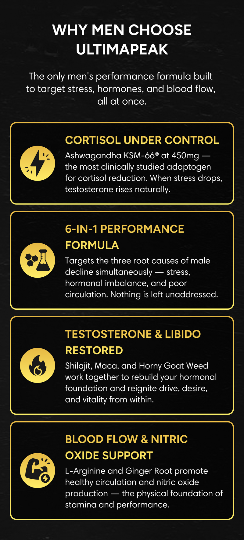We use carefully selected ingredients like Shilajit, Ashwagandha, Maca, Ginger Root, L Arginine, and Horny Goat Weed, all chosen for their long history of supporting male vitality, libido, circulation, and performance.