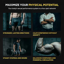 • L-Arginine and Horny Goat Weed enhance nitric oxide production and circulation, ensuring strong, lasting erections.